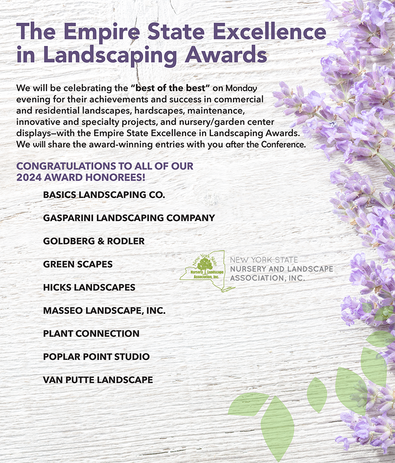 ![]() The Empire State Excellence in Landscaping AwardsNYSNLA is very pleased to announce the return of its annual statewide awards in recognition of outstanding landscaping projects. Previously known as the New York State Environmental Beautification Awards, this revitalized program is now known as: The Empire State Excellence in Landscaping Awards Program We are excited to announce that this statewide recognition for the best work of our industry and profession has been resurrected—culminating with the presentation of the awards at the 2024 Annual Conference & Expo at the Albany Capital Center on Monday, October 21, 2024! Projects may be entered under any of the following categories: Best Commercial Landscape Best Residential Landscape Best Commercial Hardscape Best Residential Hardscape Best Landscape Lighting Best Commercial Maintenance Best Residential Maintenance Best Innovative and Specialty Project New Category as we relaunch these statewide awards! Best Nursery/Garden Center Display Eligibility for this New Category: Entries are inclusive of companies and organizations of any size (members in good standing) located in NYS with outdoor living areas / display models of any size, scale and budget. Outdoor living models must solve landscape issues, create and enhance the beauty and functionality of the space and be a connection to nature. The purpose of these are to educate and inspire homeowners, contractors, designers, and architects to help put all the pieces together, create beautiful outdoor living areas and reconnect with nature. ENTRY RULES All Entries Submitted Must Include: